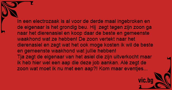 In een electrozaak is al voor de derde maal ingebroken en de eigenaar is het grondig beu. Hij zegt tegen zijn zoon ga naar het dierenasiel en koop daar de beste en gemeenste waakhond wat ze hebben! De zoon vertekt naar het dierenasiel en zegt wat het ook moge kosten ik wil de beste en gemeenste waakhond wat jullie hebben!