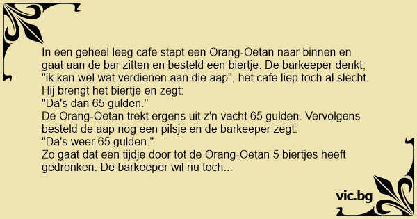 In een geheel leeg cafe stapt een Orang-Oetan naar binnen en gaat aan de bar zitten en besteld een biertje. De barkeeper denkt, "ik kan wel wat verdienen aan die aap", het cafe liep toch al slecht. Hij brengt het biertje en zegt: