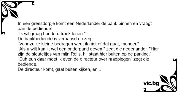 In een grensdorpje komt een Nederlander de bank binnen en vraagt aan de bediende: