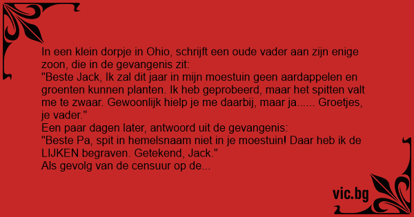 "Beste Pa, spit in hemelsnaam niet in je moestuin! Daar heb ik de LIJKEN begraven. Getekend, Jack."