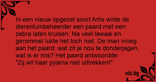 In een nieuw opgezet soort Artis wilde de dierentuinbeheerder een paard met een zebra laten kruisen. Na veel lawaai en gerommel lukte het toch niet. De man vroeg aan het paard: wat zit je nou te donderjagen, wat is er mis? Het paard antwoordde: