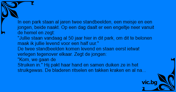 In een park staan al jaren twee standbeelden, een meisje en een jongen, beide naakt. Op een dag daalt er een engeltje neer vanuit de hemel en zegt: