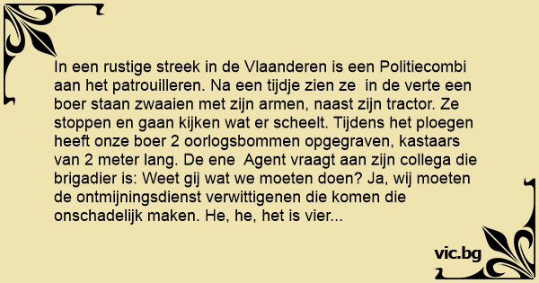 In een rustige streek in de Vlaanderen is een Politiecombi aan het patrouilleren. Na een tijdje zien ze in de verte een boer staan zwaaien met zijn armen, naast zijn tractor. Ze stoppen en gaan kijken wat er scheelt. Tijdens het ploegen heeft onze boer 2 oorlogsbommen opgegraven, kastaars van 2 meter lang. De ene Agent vraagt aan zijn collega die brigadier is: Weet gij wat we moeten doen? Ja, wij moeten de ontmijningsdienst verwittigenen die komen die onschadelijk maken. He, he, het is vier uur, om vijf uur hebben wij gedaan en die mannen van de Ontmijningsdienst moeten van Heverlee komen. Dan in het zeker zes uur eer ze hier zijn en dat wil zeggen dat we overuren aan ons been hebben. Hebt gij een betere oplossing? Als we ze nu meenemen naar het bureau dan moeten ze er daar maar hun plan mee trekken. Is dat niet te gevaarlijk? We leggen ze heel voorzichtig achter in de camionette en we rijden stilletjes naar het bureau. En als er nu onderweg toch één ontploft?