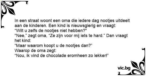 In een straat woont een oma die iedere dag nootjes uitdeelt aan de kinderen. Een kind is nieuwsgierig en vraagt: