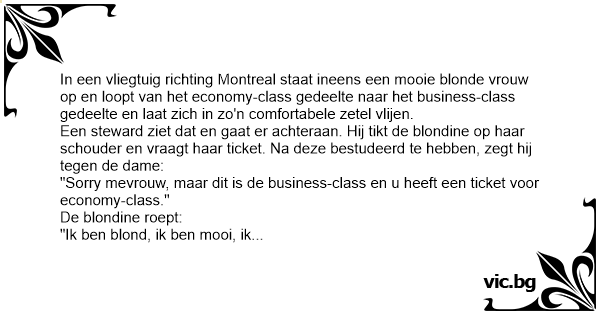 In een vliegtuig richting Montreal staat ineens een mooie blonde vrouw op en loopt van het economy-class gedeelte naar het business-class gedeelte en laat zich in zo'n comfortabele zetel vlijen.