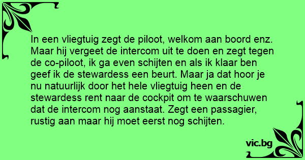 In een vliegtuig zegt de piloot, welkom aan boord enz. Maar hij vergeet de intercom uit te doen en zegt tegen de co-piloot, ik ga even schijten en als ik klaar ben geef ik de stewardess een beurt. Maar ja dat hооr je nu natuurlijk door het hele vliegtuig heen en de stewardess rent naar de cockpit om te waarschuwen dat de intercom nog aanstaat. Zegt een passagier, rustig aan maar hij moet eerst nog schijten.