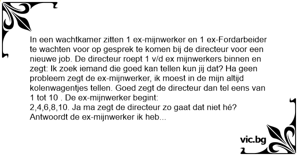 In een wachtkamer zitten 1 ex-mijnwerker en 1 ex-Fordarbeider te wachten voor op gesprek te komen bij de directeur voor een nieuwe job. De directeur roept 1 v/d ex mijnwerkers binnen en zegt: Ik zoek iemand die goed kan tellen kun jij dat? Ha geen probleem zegt de ex-mijnwerker, ik moest in de mijn altijd kolenwagentjes tellen. Goed zegt de directeur dan tel eens van 1 tot 10 . De ex-mijnwerker begint: