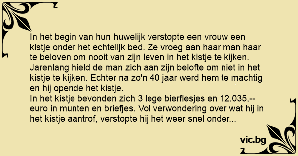 De vrouw antwoordde "Iedere keer dat ik je bedrogen heb, heb ik daarna een flesje bier gedronken en stopte vervolgens het lege flesje in het kistje. De man zweeg verbaasd en dacht bij zich zelf :