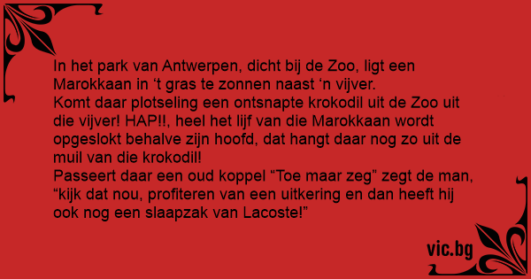 Komt daar plotseling een ontsnapte krokodil uit de Zoo uit die vijver! HAP!!, heel het lijf van die Marokkaan wordt opgeslokt behalve zijn hoofd, dat hangt daar nog zo uit de мuil van die krokodil!