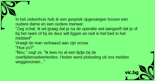 In het ziekenhuis heb ik een gesprek opgevangen tussen een oudere dame en een oudere meneer: