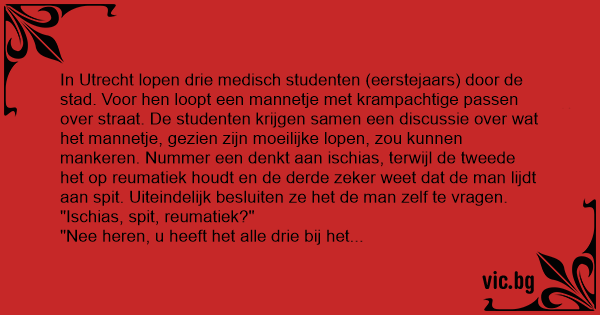 In Utrecht lopen drie medisch studenten (eerstejaars) door de stad. Voor hen loopt een mannetje met krampachtige passen over straat. De studenten krijgen samen een discussie over wat het mannetje, gezien zijn moeilijke lopen, zou kunnen mankeren. Nummer een denkt aan ischias, terwijl de tweede het op reumatiek houdt en de derde zeker weet dat de man lijdt aan spit. Uiteindelijk besluiten ze het de man zelf te vragen. "Ischias, spit, reumatiek?"