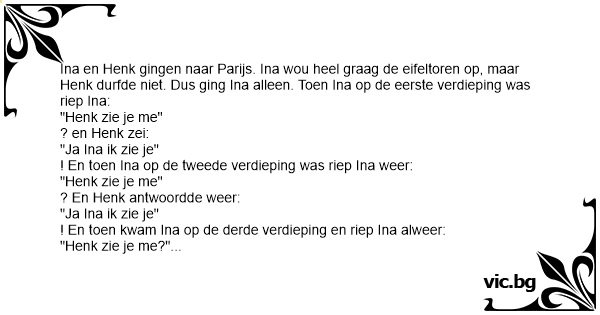 Ina en Henk gingen naar Parijs. Ina wou heel graag de eifeltoren op, maar Henk durfde niet. Dus ging Ina alleen. Toen Ina op de eerste verdieping was riep Ina: