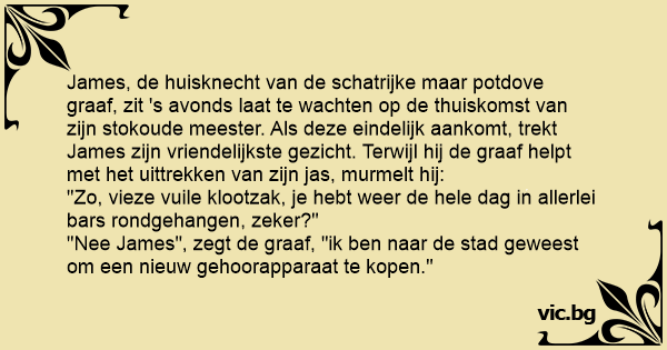 "Nee James", zegt de graaf, "ik ben naar de stad geweest om een nieuw gehoorapparaat te kopen."