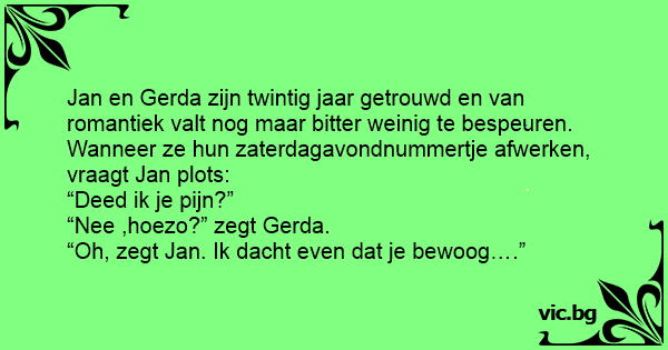 Jan en Gerda zijn twintig jaar getrouwd en van romantiek valt nog maar bitter weinig te bespeuren. Wanneer ze hun zaterdagavondnummertje afwerken, vraagt Jan plots: