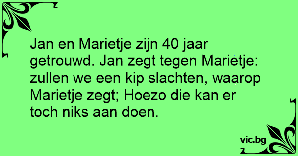 Jan en Marietje zijn 40 jaar getrouwd. Jan zegt tegen Marietje: zullen we een kip slachten, waarop Marietje zegt; Hoezo die kan er toch niks aan doen.