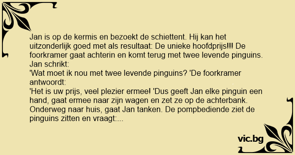 'Het is uw prijs, veel plezier ermee! 'Dus geeft Jan elke pinguin een hand, gaat ermee naar zijn wagen en zet ze op de achterbank. Onderweg naar huis, gaat Jan tanken. De pompbediende ziet de pinguins zitten en vraagt: