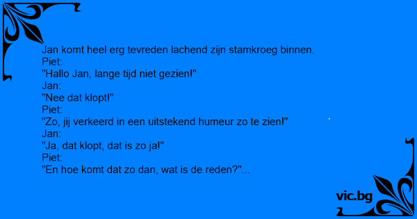 Jan komt heel erg tevreden lachend zijn stamkroeg binnen.