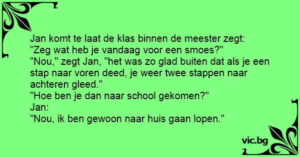 "Nou," zegt Jan, "het was zo glad buiten dat als je een stap naar voren deed, je weer twee stappen naar achteren gleed."