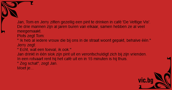 Jan, Tom en Jerry zitten gezellig een pint te drinken in café 'De Vettige Vis'.