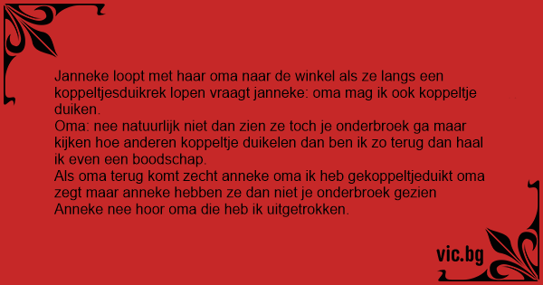 Als oma terug komt zecht anneke oma ik heb gekoppeltjeduikt oma zegt maar anneke hebben ze dan niet je onderbroek gezien
