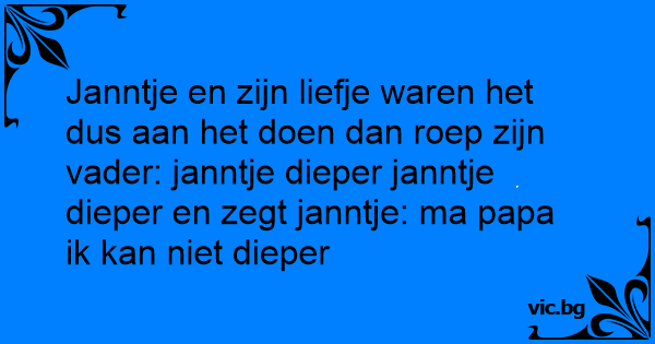 Janntje en zijn liefje waren het dus aan het doen dan roep zijn vader: janntje dieper janntje dieper en zegt janntje: ma papa ik kan niet dieper