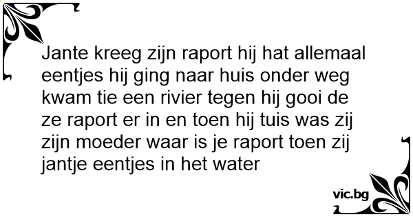 Jante kreeg zijn raport hij hat allemaal eentjes hij ging naar huis onder weg kwam tie een rivier tegen hij gooi de ze raport er in en toen hij tuis was zij zijn moeder waar is je raport toen zij jantje eentjes in het water