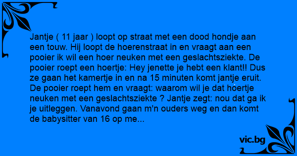 De pooier roept hem en vraagt: waarom wil je dat hoertje nеuкеn met een geslachtsziekte ? Jantje zegt: nou dat ga ik je uitleggen. Vanavond gaan m'n ouders weg en dan komt de babysitter van 16 op me passen, ze gaat me een beurt geven want ze houd van kleine jongens, dus zij krijgt van mij de geslachtsziekte. Als m'n ouders terug komen brengt mijn vader haar met de auto naar huis, hij geeft haar dan een beurt, ik ken hem dus hij krijgt van haar de geslachtsziekte. Als hij thuis komt geeft hij mijn moeder nog een beurt voor het slapen gaan en zij krijgt dan dus van hem de geslachtsziekte. En morgenochtend als mijn vader weg is komt de melkboer die geeft mijn moeder een beurt op de keukentafel en die кlоотzак moet ik hebben want hij heeft mijn hondje dood gereden !!!