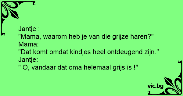Jantje vraagt waarom heb je grijs haar mam. Omdat mijn kinderen stout zijn begint mama. Waarom heeft oma dan grijshaar zegt Jantje.