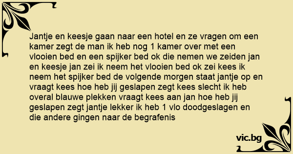 Jantje en keesje gaan naar een hotel en ze vragen om een kamer zegt de man ik heb nog 1 kamer over met een vlooien bed en een spijker bed ok die nemen we zeiden jan en keesje jan zei ik neem het vlooien bed ok zei kees ik neem het spijker bed de volgende morgen staat jantje op en vraagt kees hое heb jij geslapen zegt kees slecht ik heb overal blauwe plekken vraagt kees aan jan hое heb jij geslapen zegt jantje lekker ik heb 1 vlo doodgeslagen en die andere gingen naar de begrafenis