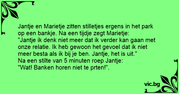 Jantje en Marietje zitten stilletjes ergens in het park op een bankje. Na een tijdje zegt Marietje: