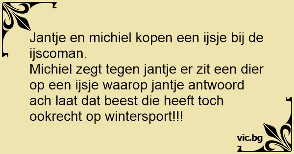 Michiel zegt tegen jantje er zit een dier op een ijsje waarop jantje antwoord ach laat dat beest die heeft toch ookrecht op wintersport!!!