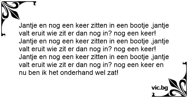 Jantje en nog een keer zitten in een bootje ,jantje valt eruit wie zit er dan nog in? nog een keer! Jantje en nog een keer zitten in een bootje ,jantje valt eruit wie zit er dan nog in? nog een keer! Jantje en nog een keer zitten in een bootje ,jantje valt eruit wie zit er dan nog in? nog een keer en nu ben ik het onderhand wel zat!