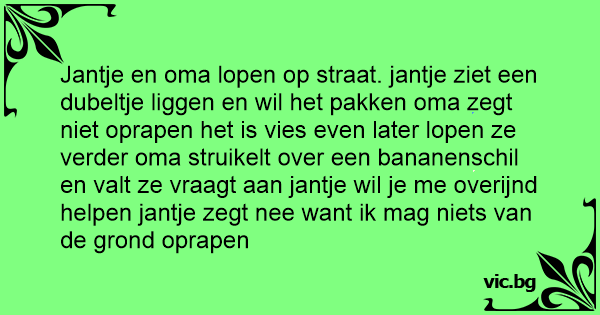 Jantje en oma lopen op straat. jantje ziet een dubeltje liggen en wil het pakken oma zegt niet oprapen het is vies even later lopen ze verder oma struikelt over een bananenschil en valt ze vraagt aan jantje wil je me overijnd helpen jantje zegt nee want ik mag niets van de grond oprapen