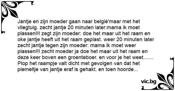 Jantje en zijn moeder gaan naar belgié'maar met het vliegtuig. zecht jantje 20 minuten later:mama ik moet plassen!!! zegt zijn moeder: doe het maar uit het raam en oke jantje heeft uit het raam geplast. weer 20 minuten later zecht jantje tegen zijn moeder: mama ik moet weer plassen!!! zecht moeder ja doe het maar uit het raam en deze keer boven een groenteboer. en voor je het weet....... Plop het raampje valt dicht met gevolgen van dat het piemeltje van jantje eraf is gehakt. en toen hoorde je plons...... het piemeltje van jantje in een рот met augurken. 20 minuten later kom er een oude vrouw (in die groente zaak)en koopt een рот met augurken en de volgende dag komt die vrouw trug bij de groentezaak en zecht: ik wil u even een kompliment geven voor u perfecte augurken!!!vooral die rozo was heeeeeel erg lekker