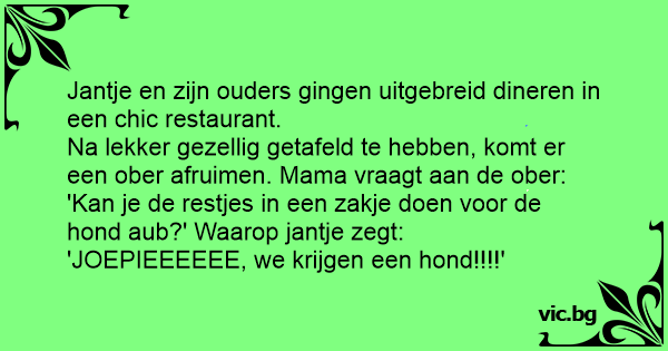 'Kan je de restjes in een zakje doen voor de hond aub?' Waarop jantje zegt: