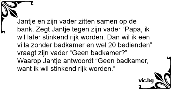 Jantje en zijn vader zitten samen op de bank. Zegt Jantje tegen zijn vader “Papa, ik wil later stinkend rijk worden. Dan wil ik een villa zonder badkamer en wel 20 bedienden” vraagt zijn vader “Geen badkamer?”