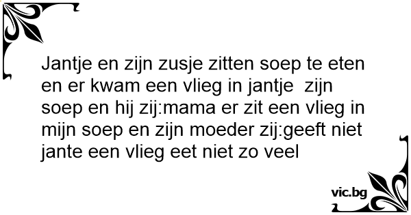 Jantje en zijn zusje zitten soep te eten en er kwam een vlieg in jantje zijn soep en hij zij:mama er zit een vlieg in mijn soep en zijn moeder zij:geeft niet jante een vlieg eet niet zo veel