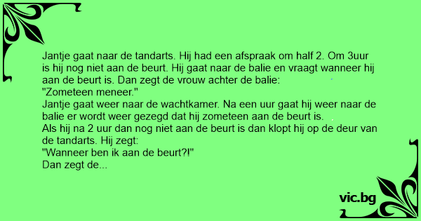 Jantje gaat naar de tandarts. Hij had een afspraak om half 2. Om 3uur is hij nog niet aan de beurt. Hij gaat naar de balie en vraagt wanneer hij aan de beurt is. Dan zegt de vrouw achter de balie: