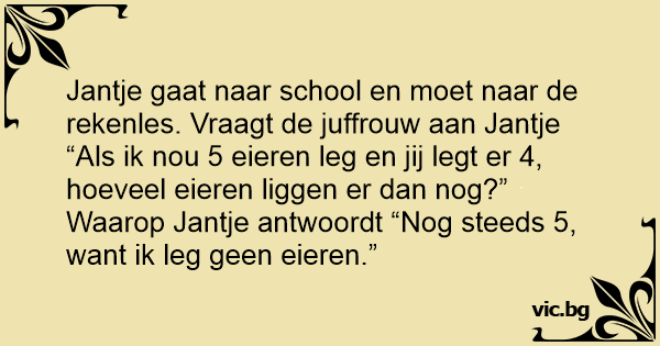 Jantje gaat naar school en moet naar de rekenles. Vraagt de juffrouw aan Jantje “Als ik nou 5 eieren leg en jij legt er 4, hoeveel eieren liggen er dan nog?”