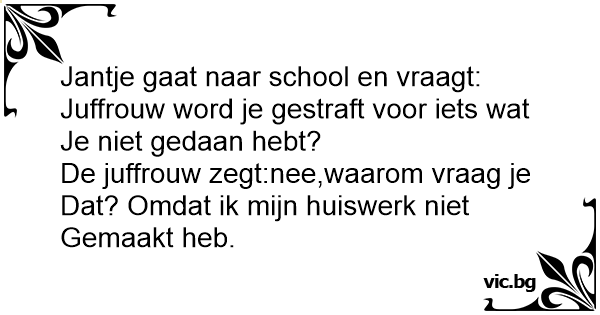 Jantje in de klas Jantje vraagt aan de leraar. Meester, krijg je ook straf als je iets niet doet? Meester: :nee waarom? Jantje: omdat ik mijn huiswerk niet heb gemaakt.