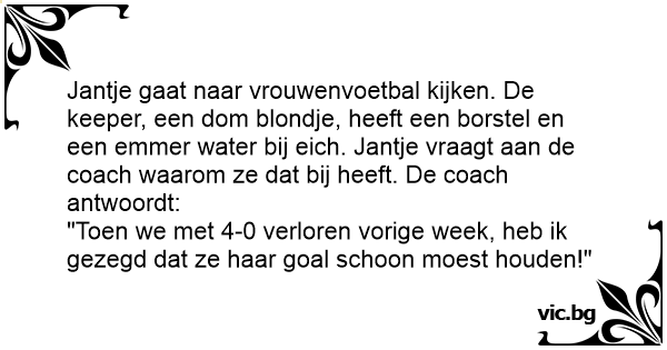 Jantje gaat naar vrouwenvoetbal kijken. De keeper, een dom blondje, heeft een borstel en een emmer water bij eich. Jantje vraagt aan de coach waarom ze dat bij heeft. De coach antwoordt:
