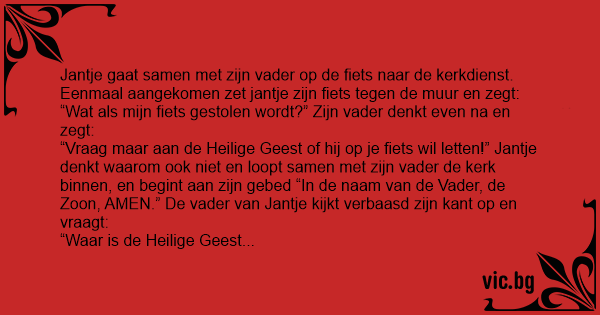 “Vraag maar aan de Heilige Geest of hij op je fiets wil letten!” Jantje denkt waarom ook niet en loopt samen met zijn vader de kerk binnen, en begint aan zijn gebed “In de naam van de Vader, de Zoon, AMEN.” De vader van Jantje kijkt verbaasd zijn kant op en vraagt: