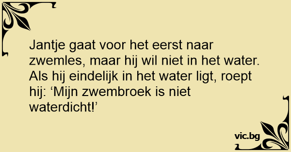 Als hij eindelijk in het water ligt, roept hij: ‘Mijn zwembroek is niet waterdicht!’