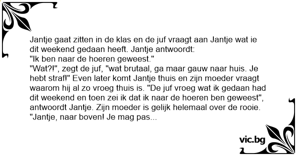 "Wat?!", zegt de juf, "wat brutaal, ga maar gauw naar huis. Je hebt straf!" Even later komt Jantje thuis en zijn moeder vraagt waarom hij al zo vroeg thuis is. "De juf vroeg wat ik gedaan had dit weekend en toen zei ik dat ik naar de hoeren ben geweest", antwoordt Jantje. Zijn moeder is gelijk helemaal over de rooie. "Jantje, naar boven! Je mag pas weer beneden komen als je zegt dat je dat nooit meer zal doen."