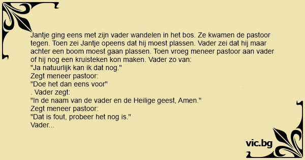 Jantje ging eens met zijn vader wandelen in het bos. Ze kwamen de pastoor tegen. Toen zei Jantje opeens dat hij moest plassen. Vader zei dat hij maar achter een boom moest gaan plassen. Toen vroeg meneer pastoor aan vader of hij nog een kruisteken kon maken. Vader zo van: