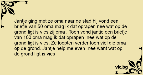 Jantje ging met ze oma naar de stad hij vond een briefje van 50 oma mag ik dat oprapen nee wat op de grond ligt is vies zij oma . Toen vond jantje een briefje van 100 oma mag ik dat oprapen ,nee wat op de grond ligt is vies. Ze loopten verder toen viel die oma op de grond. Jantje help me even ,nee want wat op de grond ligt is vies