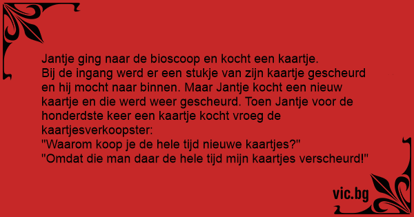 Mijnheer Dietsgaat naar de biscoop, hij loopt naar de kassa. De mevrouw aan de kassa zegt:maar mijnheer dit is al u 7de keer bij de kassa. Mijnheer Diets:Ja weet ik, maar bij de ingang scheuren ze...