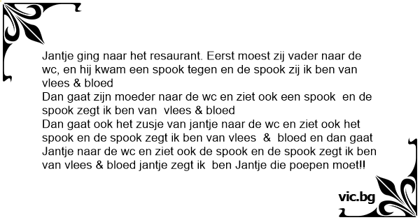 Dan gaat ook het zusje van jantje naar de wc en ziet ook het sроок en de sроок zegt ik ben van vlees & bloed en dan gaat Jantje naar de wc en ziet ook de sроок en de sроок zegt ik ben van vlees & bloed jantje zegt ik ben Jantje die poepen moet!!