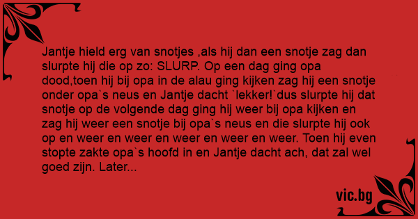 Jantje hield erg van snotjes ,als hij dan een snotje zag dan slurpte hij die op zo: SLURP. Op een dag ging opa dood,toen hij bij opa in de alau ging kijken zag hij een snotje onder opa`s neus en Jantje dacht `lekker!`dus slurpte hij dat snotje op de volgende dag ging hij weer bij opa kijken en zag hij weer een snotje bij opa`s neus en die slurpte hij ook op en weer en weer en weer en weer en weer. Toen hij even stopte zakte opa`s hoofd in en Jantje dacht ach, dat zal wel goed zijn. Later vroeg Jantje aan zijn moeder waar aan is opa eigenlijk gestorven. Mamma zei:aan een etterhoofd.
