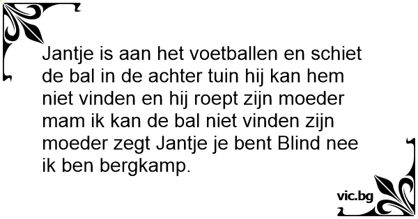 Jantje is aan het voetballen en schiet de bal in de achter tuin hij kan hem niet vinden en hij roept zijn moeder mam ik kan de bal niet vinden zijn moeder zegt Jantje je веnт Blind nee ik ben bergkamp.